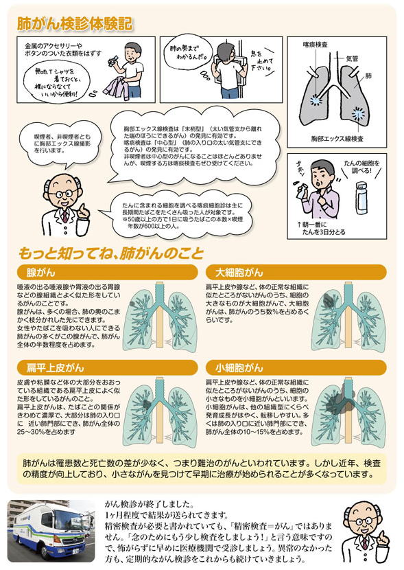 低線量ct検診、肺がん死亡リスクを51%低減|医療ニュー. 第26回日本ct検診学会(2月8~9日)で開かれた記者会見で、大会長で日立製作所日立総合病院(茨城県)総合健診センタ長の名和健氏は、茨城県. 肺がん検診では何をするの? 肺がんを早期発見して予防するに. がん検診の目的は、がんを発見することですが、単に「がんを見つける」ことだけでなく、「早期に発見し、適切な治療をすることでがんによって亡くなる方を減らす」ことです。このページでは、肺がんの検診について説明しています。. 肺がん検査・検診 予約【1599コース】から探す. 肺がん検診. 肺がんは、早期段階では自覚症状がほとんどないため、肺がん検診によって早期発見をすることが大切です。そして喫煙は、肺がんと因果関係があるとされています。喫煙歴のある人は一度肺がん検診を受診するとよいでしょう。. 肺がん検診 東京都がん検診センター. 肺がん検診 方法:胸部X線検査 および 喀痰細胞診. 胸部X線検査は全員に実施します。喀痰細胞診は、たんに含まれる細胞を調べる検査ですが、主にハイリスク者に行われます。. 肺がん検診の検査方法|知っておきたいがん検診. 精密検査の内容は異なります。 ※良性の病変と診断された場合には、主治医の指示に従ってください。 ハイリスク群とは、「喫煙指数」が400ないし600以上の場合を指します。 喫煙指数は、「1日に吸うタバコの平均本数」×